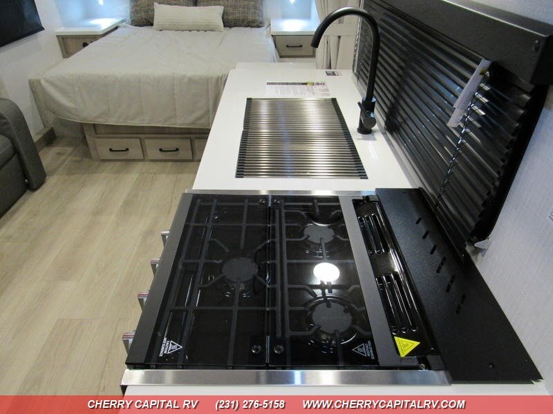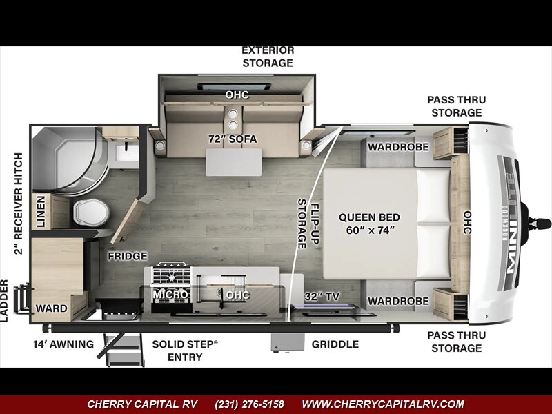 This is a GENTLY USED 2024 Rockwood 2109S has a dry weight of 4,493 lbs, a cargo capacity of 1,344 lbs, and an exterior length of 22' 4". It features a single slide-out, a Queen Walk Around Front Bedroom, and a rear corner bathroom. Key specs include a 15,000 BTU A/C, 20,000 BTU furnace, 54-gallon fresh water tank, 30-gallon grey water tank, and 30-gallon black water tank.
