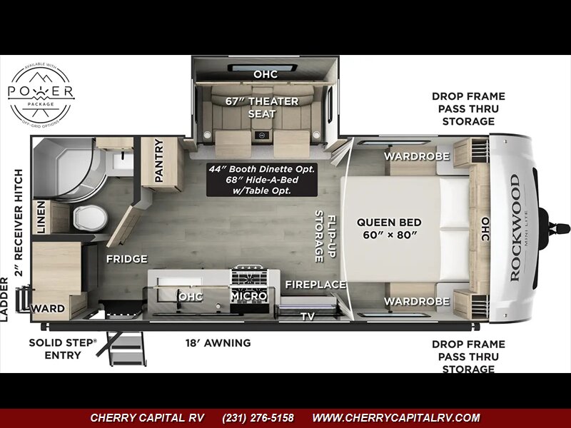 This revised floorplan features wide open living space and a drop frame for large front pass through storage. The baggage door on the front pass through is 30” by 24” which will accommodate all your camping accessories. The floor space in this unit caters to pet-friendly campers with room for kennels and large animal sleeping areas. If you and your pet want to cuddle up next to a nice warm fireplace with some family members on the theater seating, this is the unit for you.