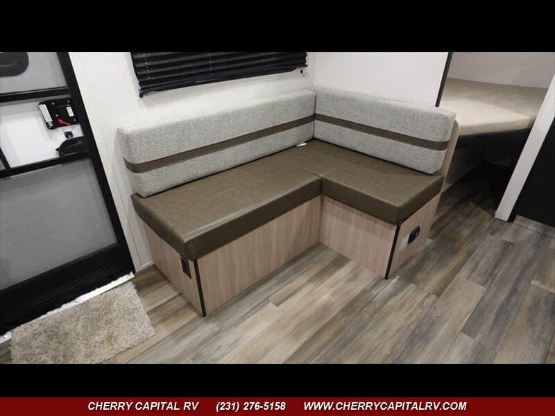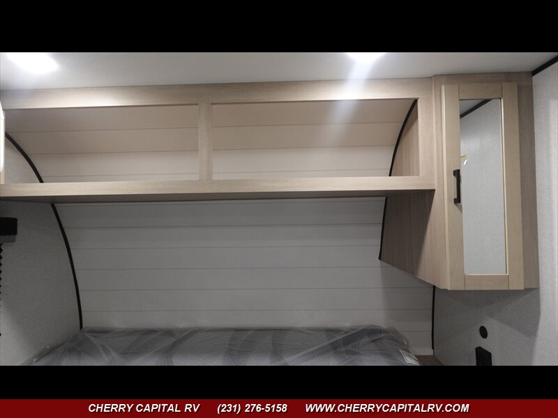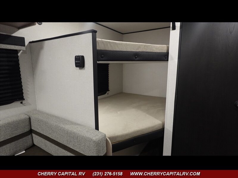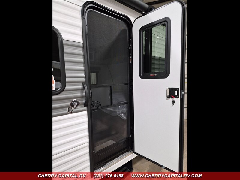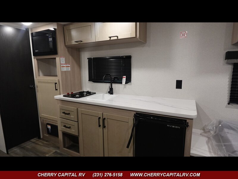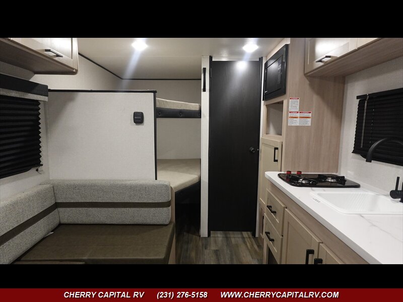 This easy to tow travel trailer features compact sleeping spaces thanks to the double-size bunk beds in the rear corner, and the private bath is right next to the bunks for easy nighttime use! You'll have the front queen bed to yourselves, along with a wardrobe, nightstand, and overhead shelf for your things. A two-burner cooktop and microwave oven will let you make meals each day, and there is a 12V refrigerator to keep your cold items fresh. Outside, you'll enjoy the 10' power awning for added shade, and there are two exterior storage compartments to keep fishing poles, hiking gear and more!