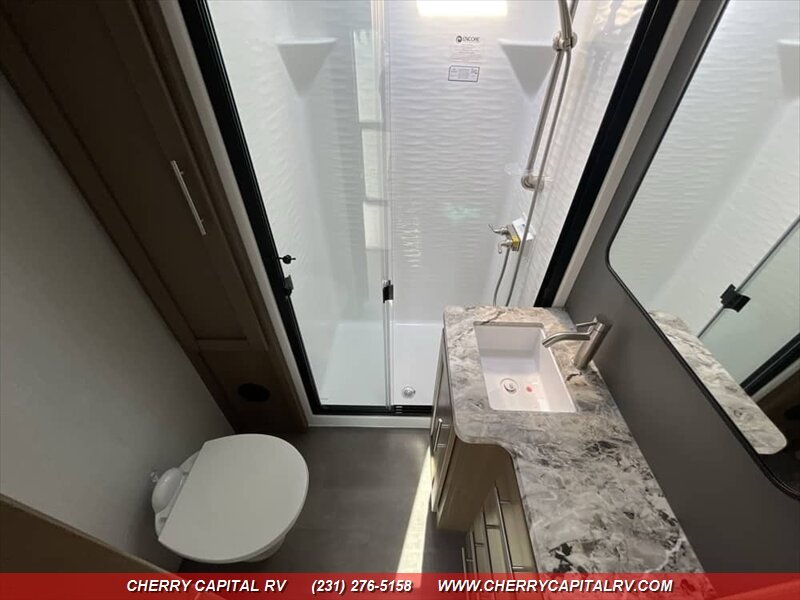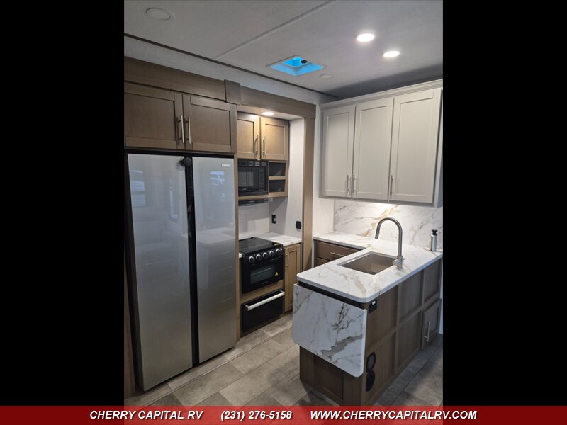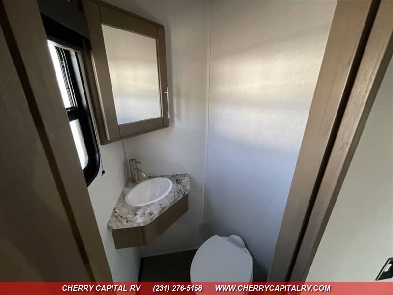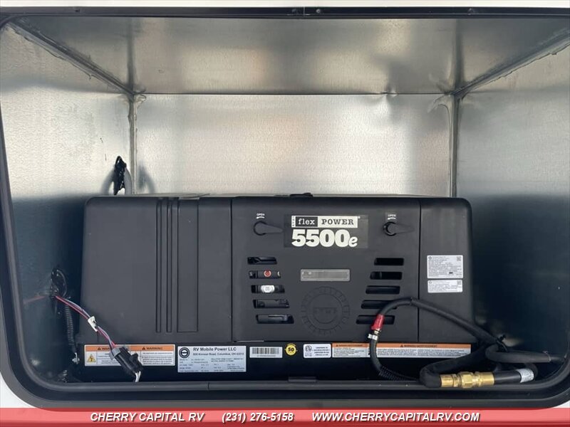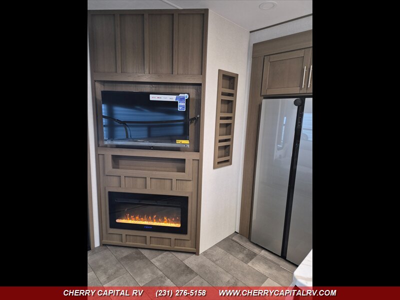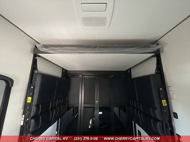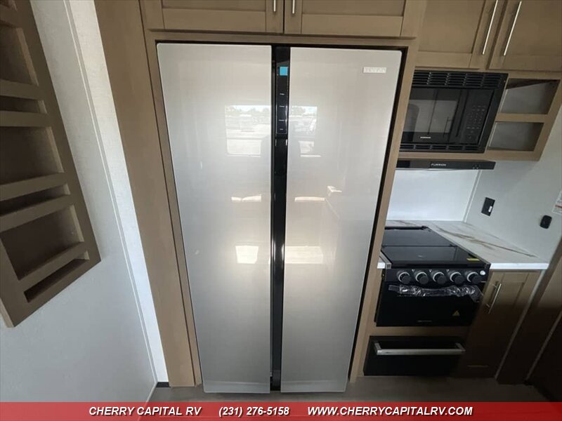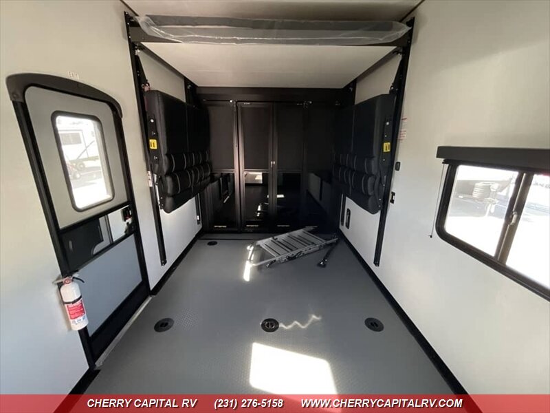 Keystone Fuzion Impact Edition toy hauler fifth wheels offer weekend warriors a lineup of shorter models - 220W Solar Flex, 16 CF Refrigerator, ADDED OPTIONS: Sliding Rear Patio Door, 5.5K Generator, King Bed, Ramp Door Patio Package, Triple AC Package!!!