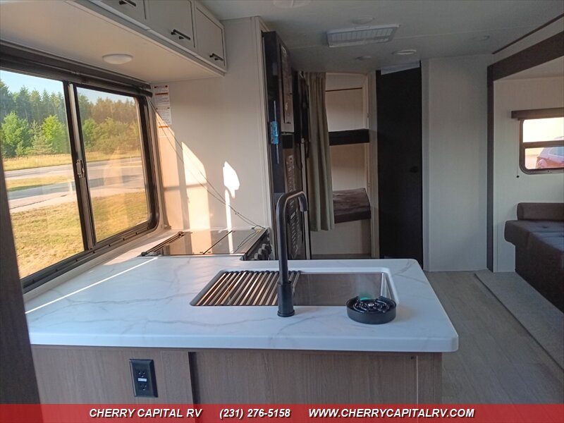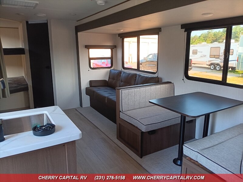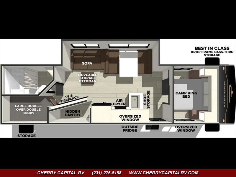 2026 Avenger 26DBS is a 50 AMP - 1 Slide, Large Double over Double Bunks, Sofa AND Dinette, Camp King Bed in a Private Room with OVERSIZED Windows - CAMPERS DELITE! HIGHLIGHTS - Large Oversized TINTED, Camp Side Windows - Large Oversized Pass Through Storage - Kayaks, Dog Kennels, Camping Gear - just a few ideas for this space. Outdoor Refrigerator - TV/FIREPLACE and Hidden Pantry! Large Refrigerator. Movable Storage Ottoman. GLASS WASHER included with Farm Style Kitchen Sink. This is a popular floor plan - priced right!