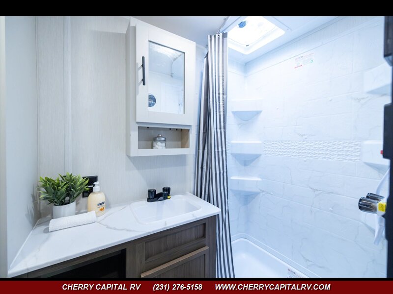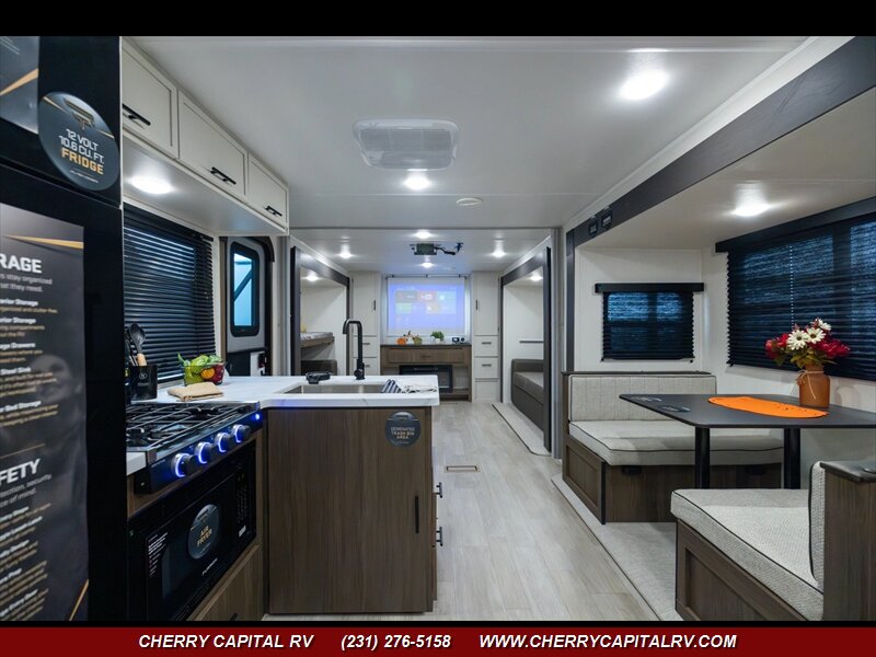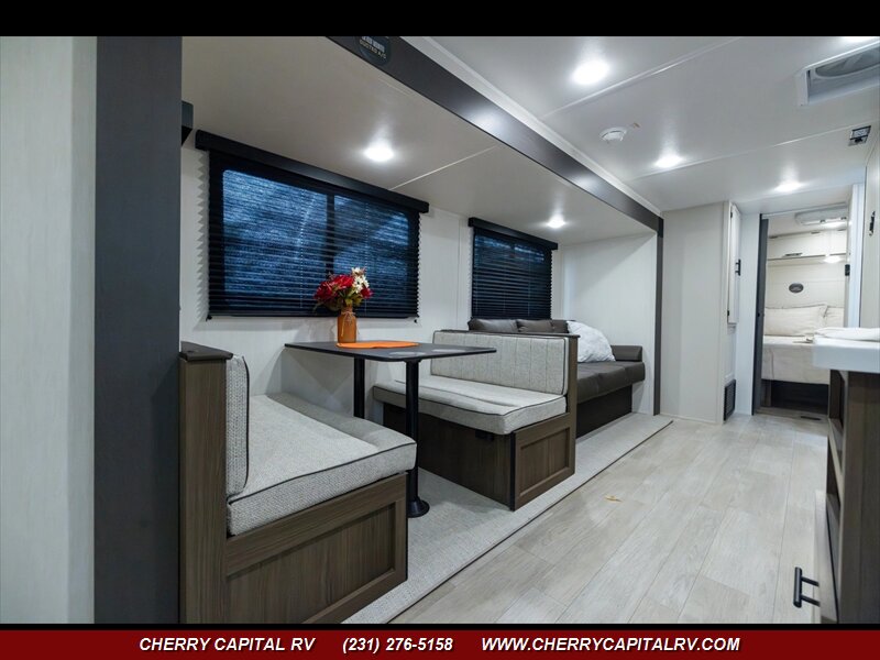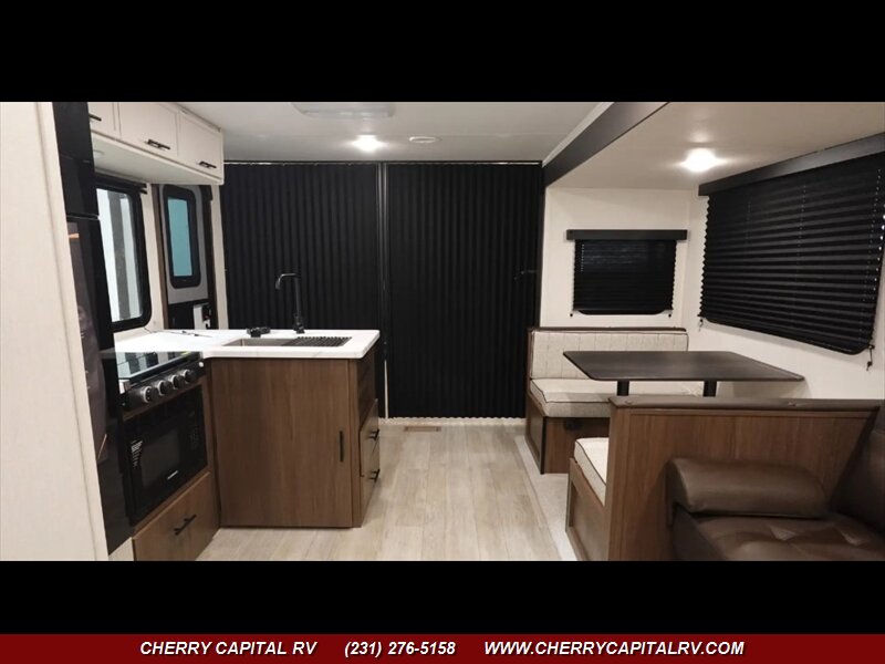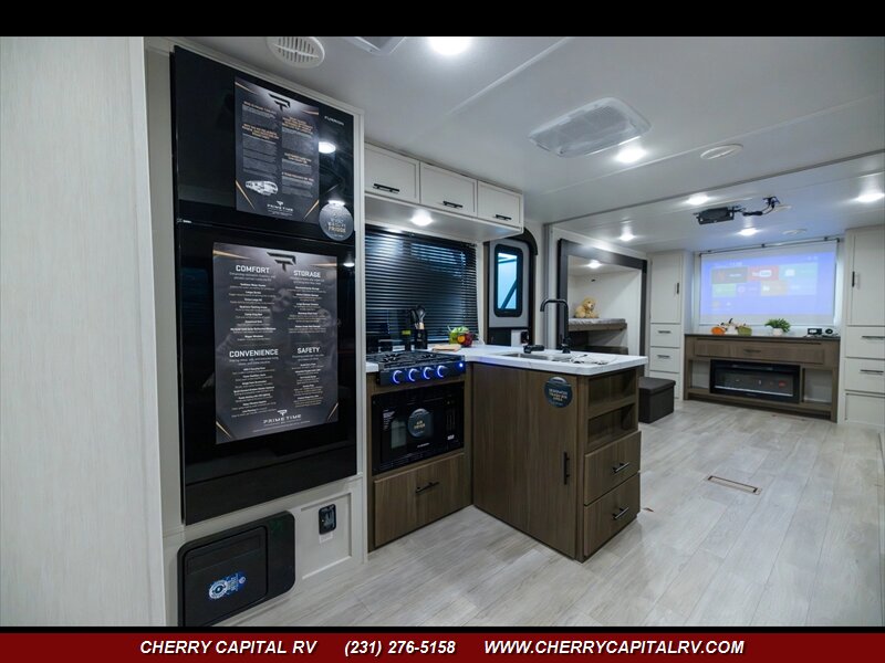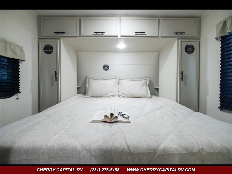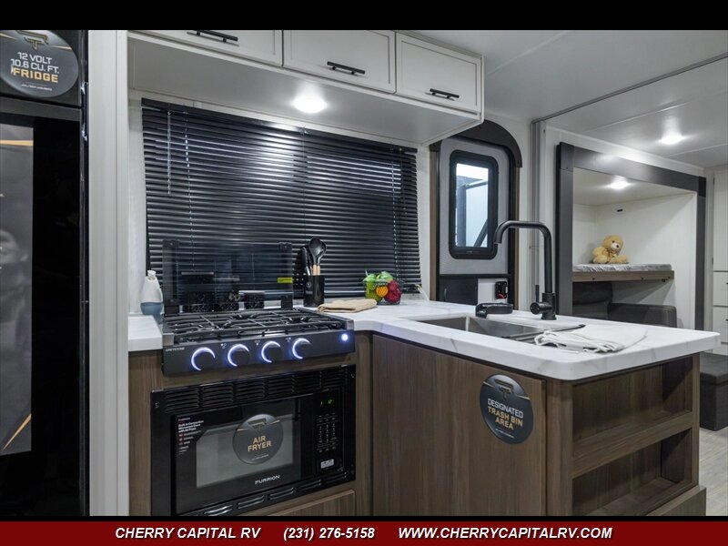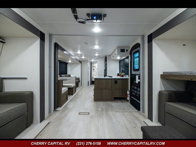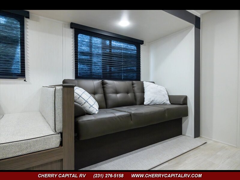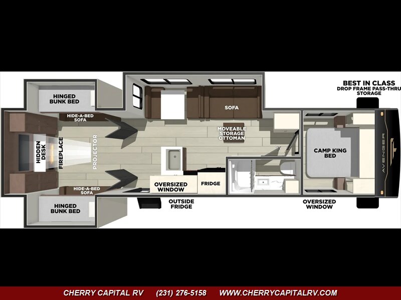 The Avenger 30PO is the ultimate bunkhouse, sleeping 10+ with three slide-outs. 2 separate rooms - the master room, up front, includes a Camp King with over head and side storage. Relax in the rear entertainment area with panoramic windows, 2 hide a bed sofas and 2 hinged bunk beds. Also in the back bedroom is a fireplace, hidden desk, PROJECTOR and plenty of storage. The windows are oversized windows giving you the best CAMP SIDE views! The living area includes a Jack Knife Sofa and Dinette. The pass through storage is large enough to put all your gear PLUS! The chef-ready kitchen features a 10.6 cu. ft. fridge and convection microwave with air fryer. Includes an outdoor fridge and drop frame pass-thru storage. 50 AMP Service with second Air Conditioner.