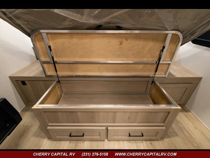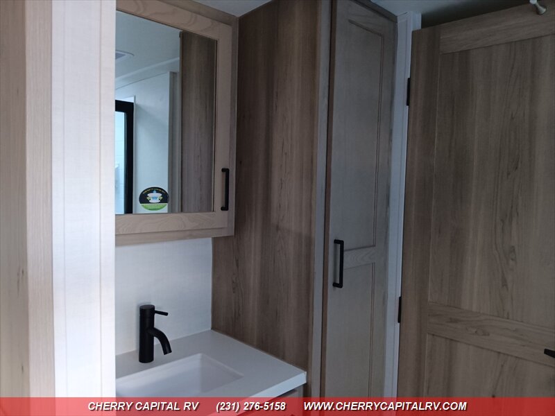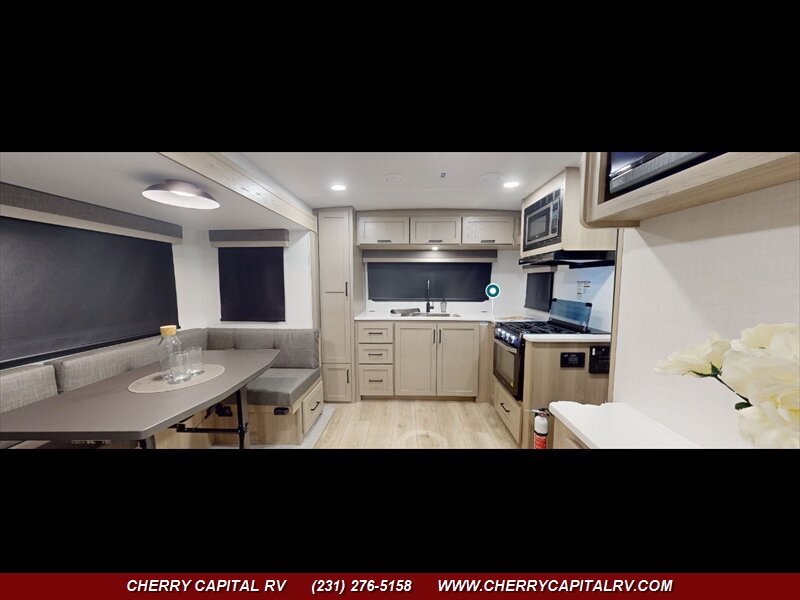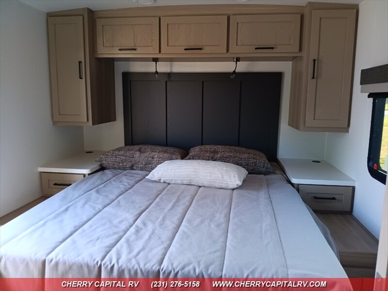 The defining feature of the 2506FK is its front kitchen design. By placing the kitchen across the full width of the coach, this layout creates expanded counter space, cabinet storage, and prep area that rivals larger trailers. For buyers who prioritize cooking comfort and workspace, this configuration separates itself from traditional mid-kitchen floorplans.