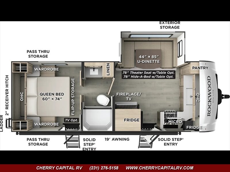 With 54 gallons of fresh water, 58 gallons of gray capacity, and 29 gallons of black, the Mini Lite supports extended weekends and longer stays. The 19-foot awning expands outdoor living space while maintaining balanced proportions.