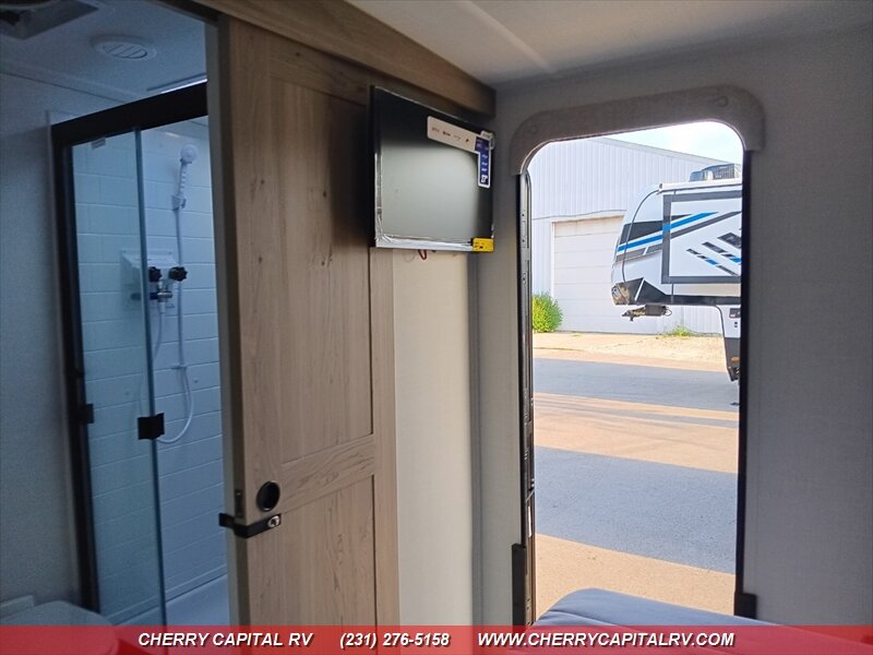 In the rear, the private bedroom includes its own exterior entry door and an additional television installation. The dual-entry design improves accessibility and allows guests or family members to move between spaces without crossing the entire coach.