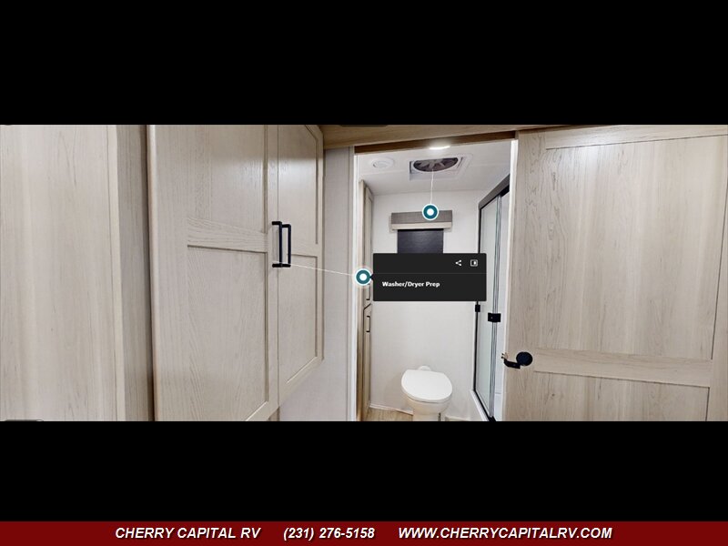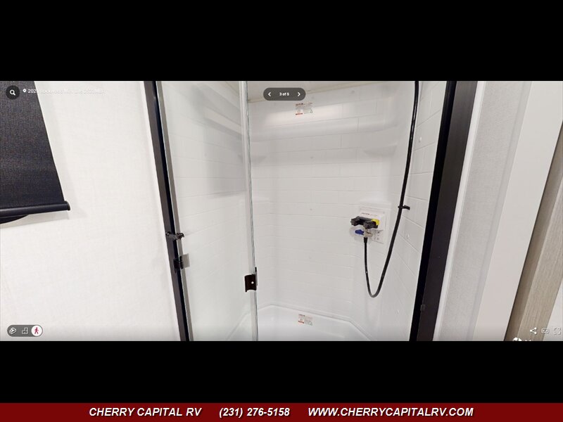 RV News 2026 RV of the Year - Lightweight Travel Trailer - The front kitchen has a large window that creates an open, inviting feel with great campsite views. Theater seating faces the entertainment center for easy viewing, with an optional hide-a-bed for guests. The bedroom includes a queen bed in a slide-out, dresser, and wardrobe with washer/dryer prep. A spacious bathroom with a large shower and linen storage adds comfort and convenience, making this coach feel like home. Included - 2 Slide Toppers, 4 Power Stabilizer Jacks, Extra Max Air Vent with Cover..